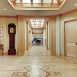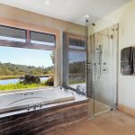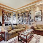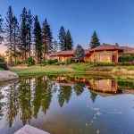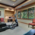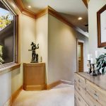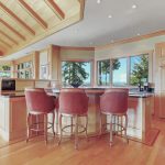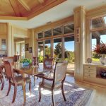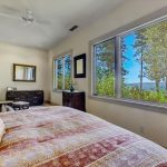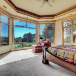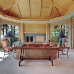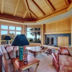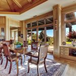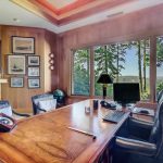 The great room features 20-foot ceilings and a Rumford fireplace, creating a grand yet cozy atmosphere. Separate guest suites, an office, and a library provide distinct spaces for work and relaxation. The romantic main suite overlooks a solar-heated swimming pool and includes individual bathrooms and closets, ensuring privacy and comfort. The home’s red oak floors with mahogany inlays and exquisite Russian Alder cabinets enhance its elegance.